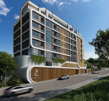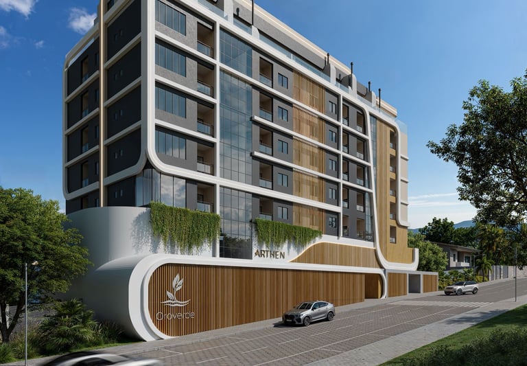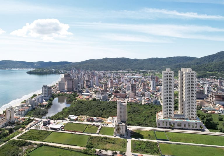 Apartamento moderno com varanda ampla e vista direta para a praia e natureza ao redor.